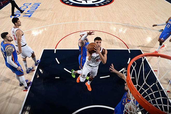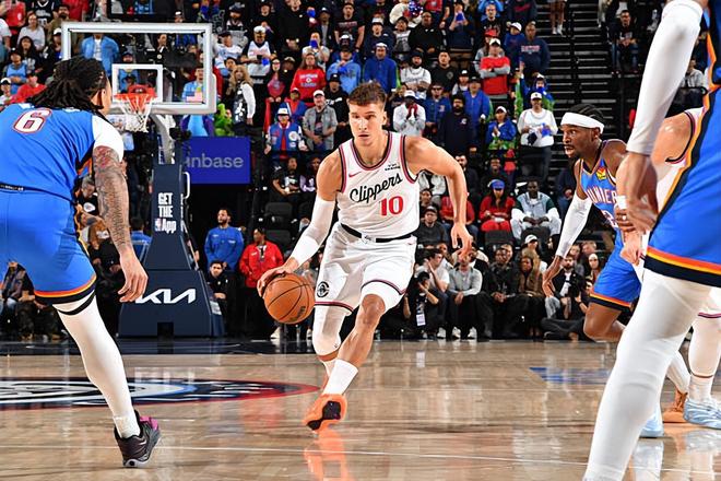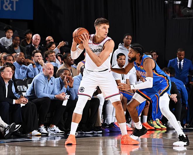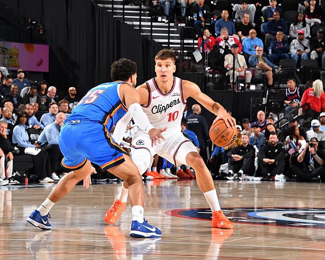 本场比赛中,快船的替补后场大将博格丹-博格达诺维奇(Bogdan Bogdanovic)的状态也算是有了一定程度的恢复。博格达诺维奇全场出场29分34秒,投篮8中3,三分线外6中2,罚球4中3,得到了11分6篮板4助攻2抢断的数据,还有1次失误和1次犯规,正负值为-17。博格达诺维奇在防守端的表现依然是惨不忍睹的水平,他也是被对手各种打爆。不过在进攻端,博格达诺维奇的表现还是有明显的回暖的,他还是展现出了自己比较全面的得分能力,他也在传球和组织方面起到了一定的作用。从本场比赛的情况来看,博格达诺维奇似乎也是快船全队除了詹姆斯-哈登(James Harden)以外持球威胁最大的球员了。